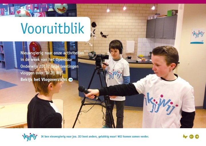In elke school maken leerling-filmteams leuke opnames over ikjijwij-situaties. Elke school heeft inmiddels een ambassadeur ikjijwij. We werken samen, met respect en nieuwsgierigheid naar de ander. Het is steeds vanzelfsprekender om iedereen in een vroeg stadium te betrekken bij de beleidsontwikkeling. ikjijwij gaat over samenwerken met leerlingen, ouders, de wijk, de wereld.