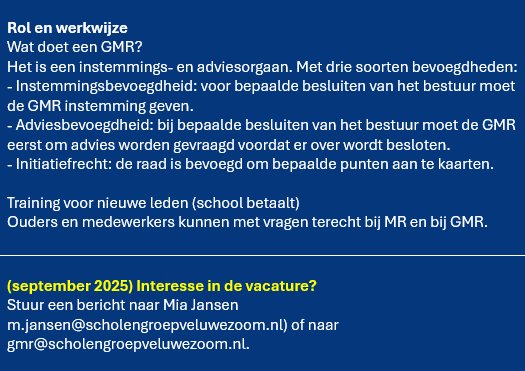In het jaarverslag en de begroting van Veluwezoom. Of stel je vraag via gmr@scholengroepveluwezoom.nl