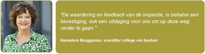 “We kijken terug op een inspirerend bezoek van de inspectie. Met een geïnteresseerde, nieuwsgierige en kritische blik is onderzoek gedaan naar onze manier van werken. We zijn blij met de bevestiging waar wij als organisatie staan. Een netwerkorganisatie van goed niveau waar wij met plezier en energie samenwerken aan onderwijsontwikkeling met een focus op hoge leeropbrengsten. Het specifieke compliment voor de professionele cultuur geeft veel erkenning", aldus Hannelore Bruggeman, voorzitter college van bestuur.