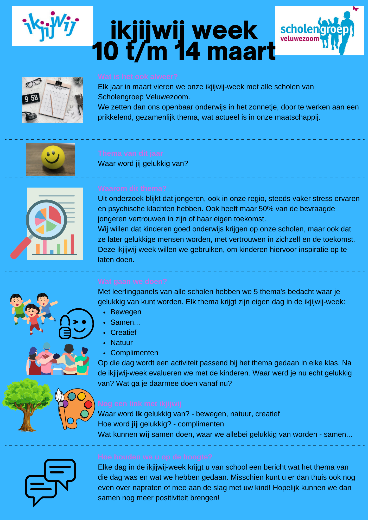 Aan vijf geluksthema's besteedden alle klassen aandacht tijdens de ikjijwij-week 2025. Sommige kinderen zijn dol op Bewegen of Iets samen doen. Andere kinderen stralen als ze Creatief bezig zijn of in de Natuur rondstruinen. Van een Compliment wordt iedereen gelukkig!